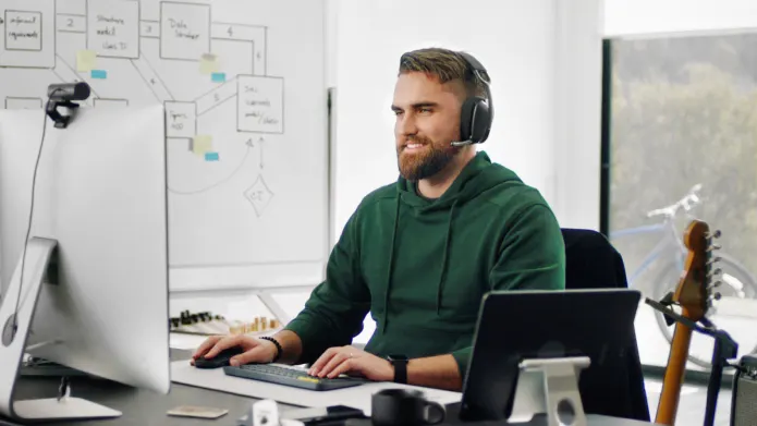 Trabaja desde casa sin perder el ritmo. La compatibilidad con las plataformas populares de reuniones y llamadas facilita la incorporación en cualquier reunión. Un micrófono con cancelación de ruido que se voltea para silenciar minimiza los sonidos de fondo para que te puedan escuchar con claridad.
