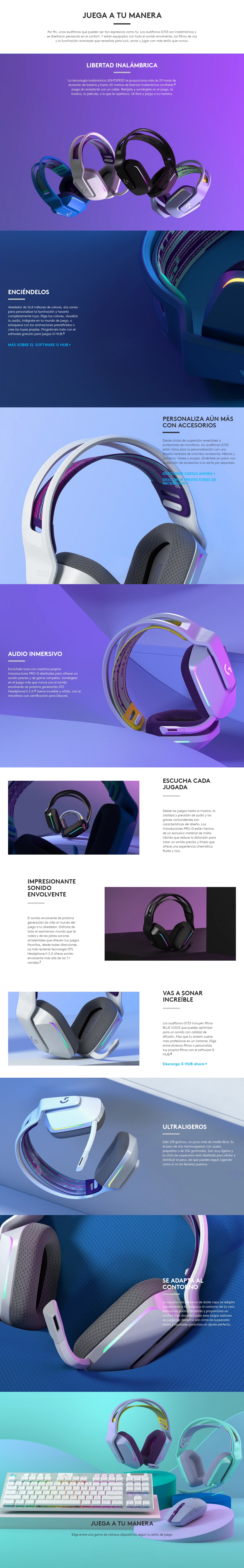 Con un estilo de uso de diadema/vincha y un tipo de auricular binaural, los G733 cuentan con retroiluminación RGB personalizable en rojo, verde y azul para un toque de estilo adicional. Además, incorporan tecnología de sonido envolvente virtual DTS Headphone:X 2.0 para una inmersión total en el juego.