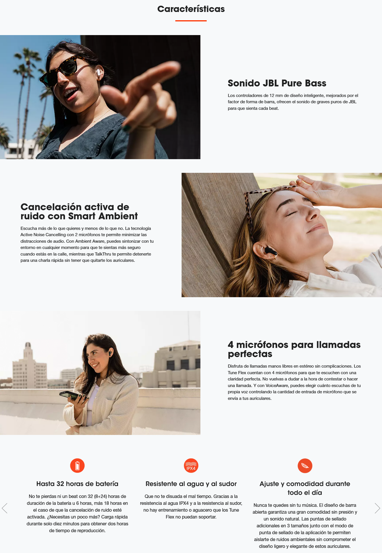 Afronta tu día canción a canción con los JBL Tune Flex. Los auriculares True Wireless te ofrecen hasta 32 horas de excepcional sonido JBL Pure Bass, mientras que su diseño ergonómico y resistente al agua te proporciona comodidad durante todo el día en cualquier clima. Un simple toque te permite gestionar y disfrutar de llamadas perfectas en cualquier lugar, sin ruidos ambientales. Y con la tecnología Active Noise Cancelling y Smart Ambient, tú eliges si quieres desconectar del mundo o relacionarte con tu entorno. El diseño de barra abierta garantiza una gran comodidad durante todo el día y un sonido natural. Y lo mejor de todo es que la Aplicación de los auriculares JBL te permite personalizar tu experiencia auditiva. Conecta con tu mundo a tu manera.