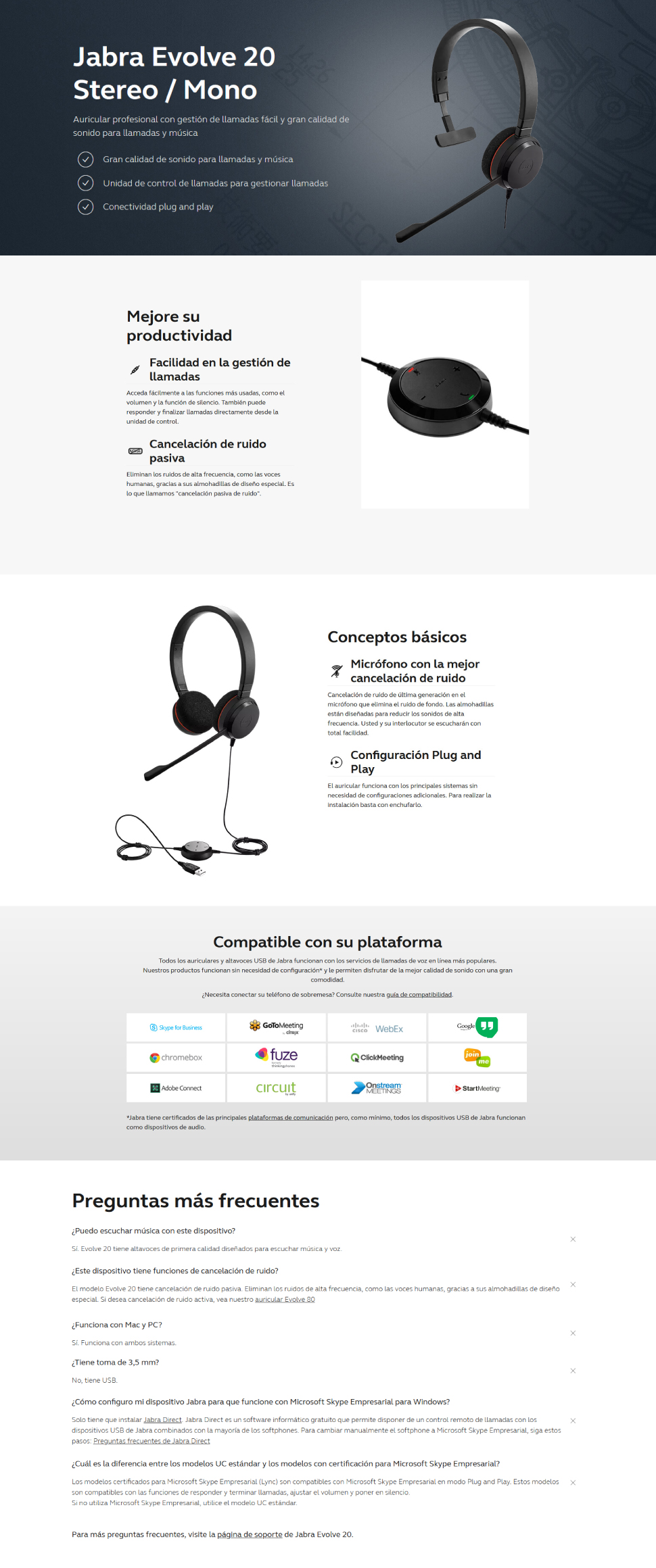 - Descripción: Jabra Evolve 20 MS stereo - Auricular - en oreja - cableado - USB - Certificado para Skype Empresarial