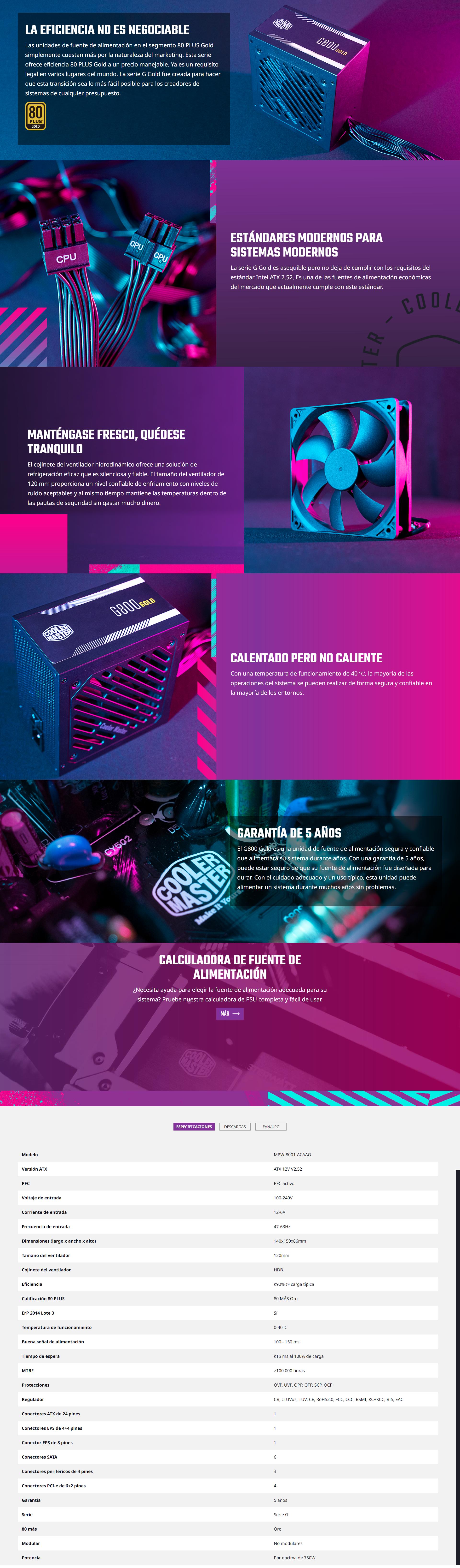 FUENTE DE PODER COOLER MASTER 800W 80 PLUS GOLD 24-PIN ATX FUENTE DE PODER COOLER MASTER 800W 80 PLUS GOLD 24-PIN ATX