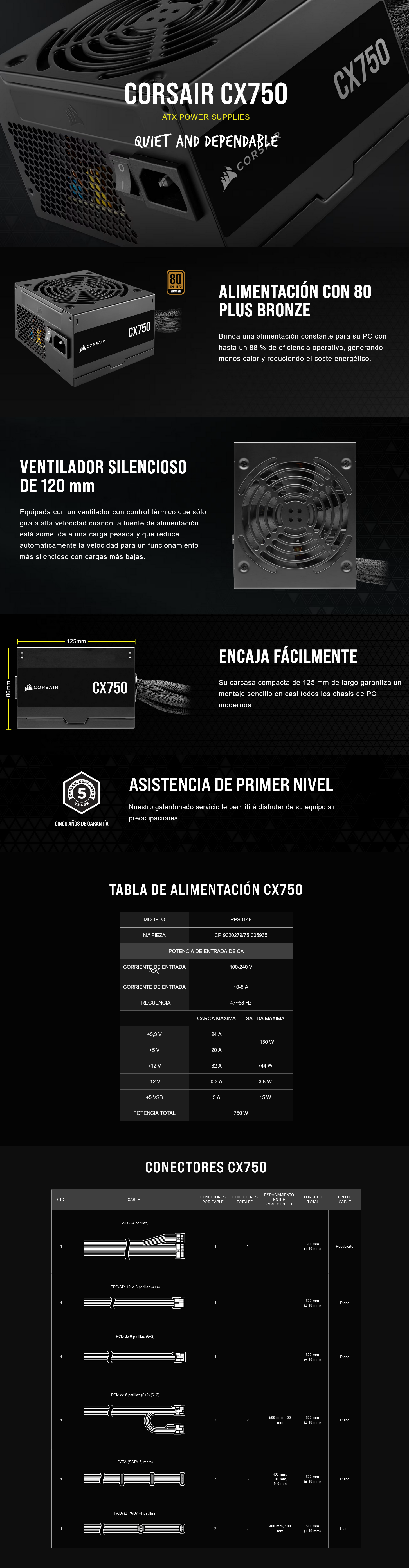 FUENTE DE PODER CORSAIR CX750 750W 80 PLUS BRONZE ATX NO MODULAR FUENTE DE PODER CORSAIR CX750 750W 80 PLUS BRONZE ATX NO MODULAR
