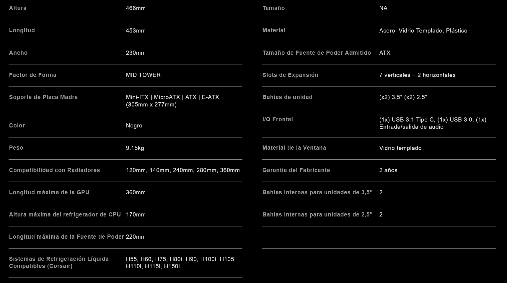 | Diámetro de ventiladores frontales soportados | 120 mm |