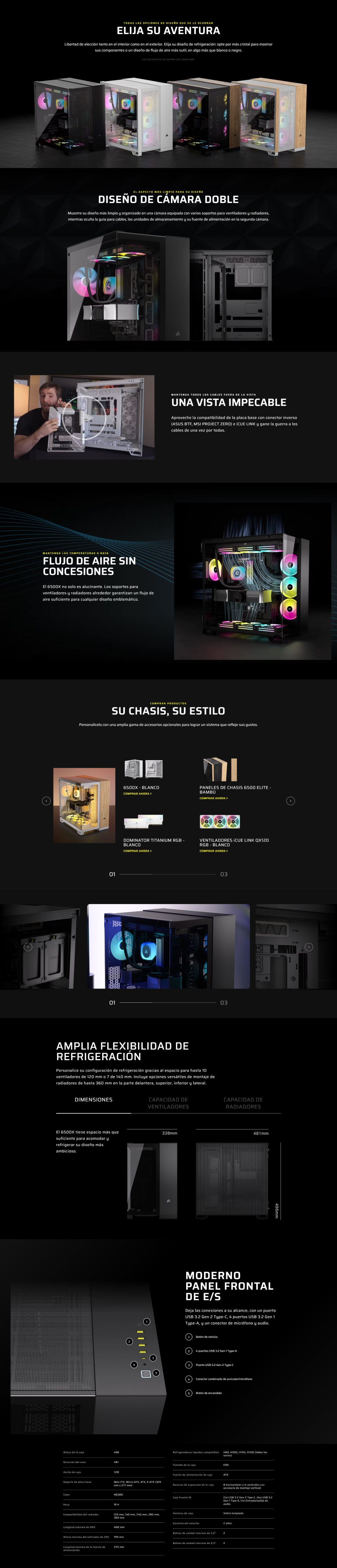 Construido con materiales de alta calidad, como plástico, acero y vidrio templado, el Corsair 6500X garantiza durabilidad y resistencia. Su factor de forma ATX es compatible con una amplia gama de placas madre, lo que lo convierte en una opción versátil para diferentes configuraciones de PC. Además, cuenta con múltiples bahías de almacenamiento, incluyendo tres bahías de 3,5 pulgadas y tres de 2,5 pulgadas, lo que permite una fácil expansión y organización de tus discos duros y unidades SSD.