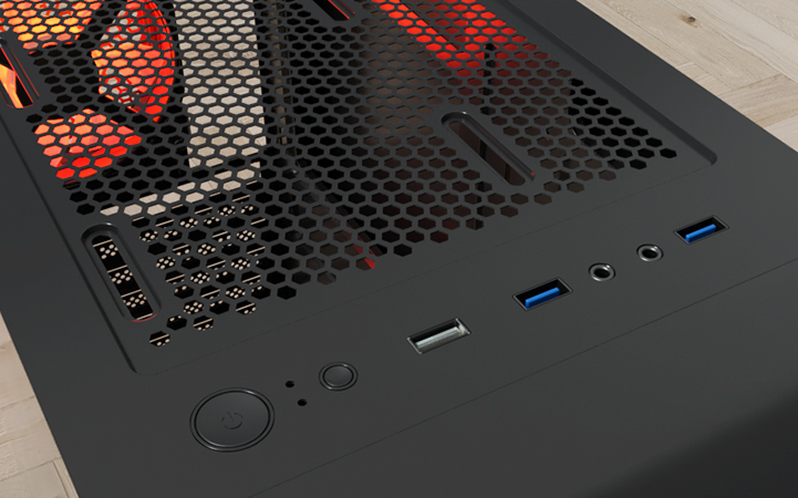 En cuanto a conectividad, el gabinete está equipado con 2 puertos USB 2.0, 1 puerto USB 3.2 Gen 2 y entradas de audio, facilitando la conexión de tus dispositivos y periféricos. El botón de encendido/apagado cuenta con un indicador LED, añadiendo un toque de modernidad a su diseño.