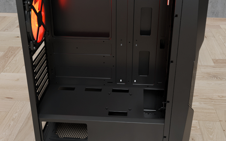 El gabinete incluye 2 bahías de 3,5" y 2 bahías de 2,5" para discos duros y unidades de estado sólido, asegurando que tengas suficiente espacio para almacenar todos tus juegos y archivos. La gestión de cables es sencilla, con un espacio de 2 cm para mantener todo ordenado y libre de desorden.