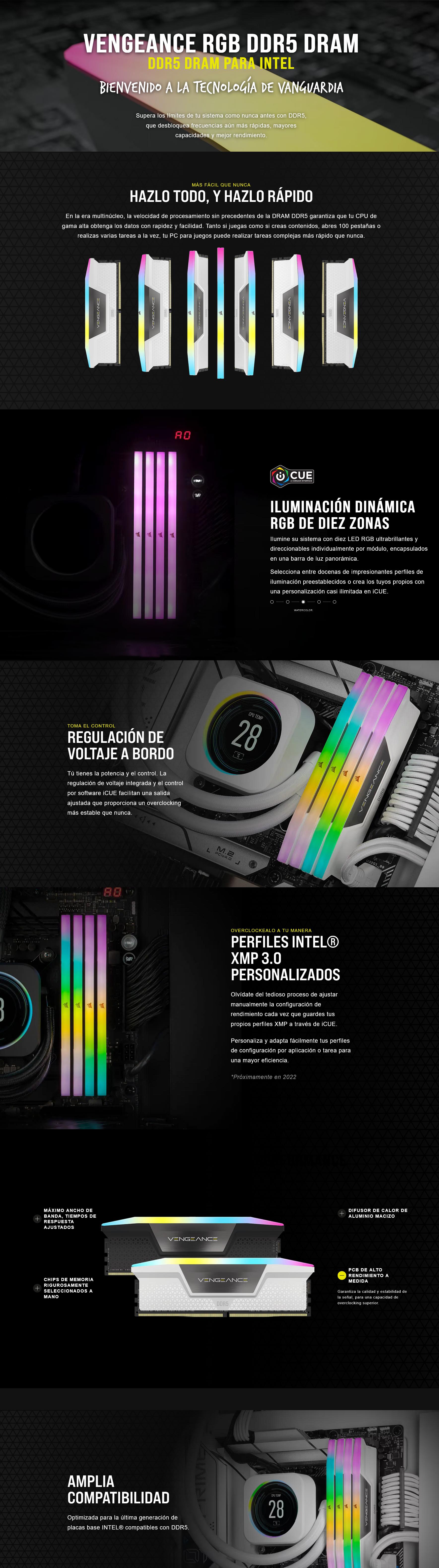 - Optimizado para el máximo ancho de banda y los tiempos de respuesta ajustados de las placas base Intel DDR5 más recientes.