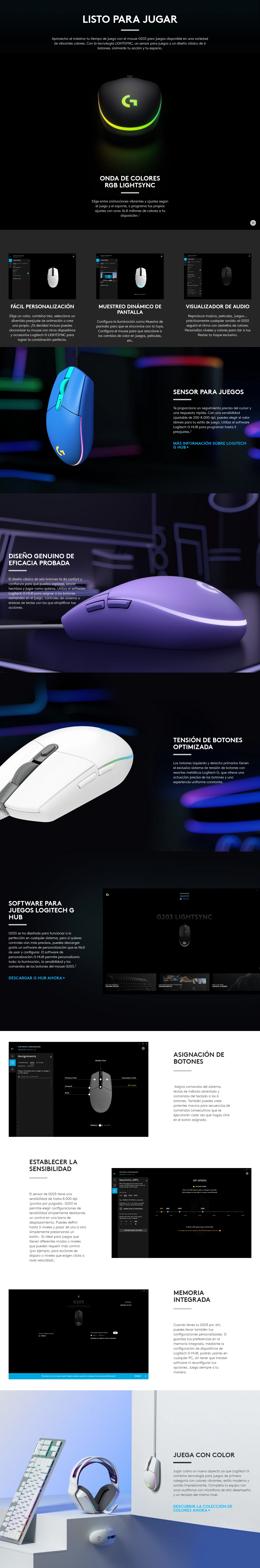 - Descripción: Logitech Gaming Mouse G203 LIGHTSYNC - Ratón - óptico - 6 botones - cableado - USB - azul