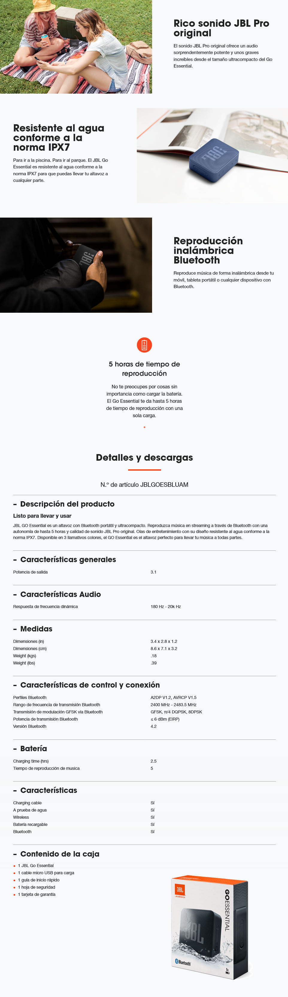 Además, el JBL Go Essential no solo es un altavoz, sino que también incluye una guía de inicio rápido y una tarjeta de garantía de un año, lo que te brinda tranquilidad y confianza en tu compra. Con su combinación de estilo, funcionalidad y calidad de sonido, el Parlante Portátil Inalámbrico JBL Go Essential es la elección perfecta para quienes buscan un altavoz que se adapte a su estilo de vida activo.