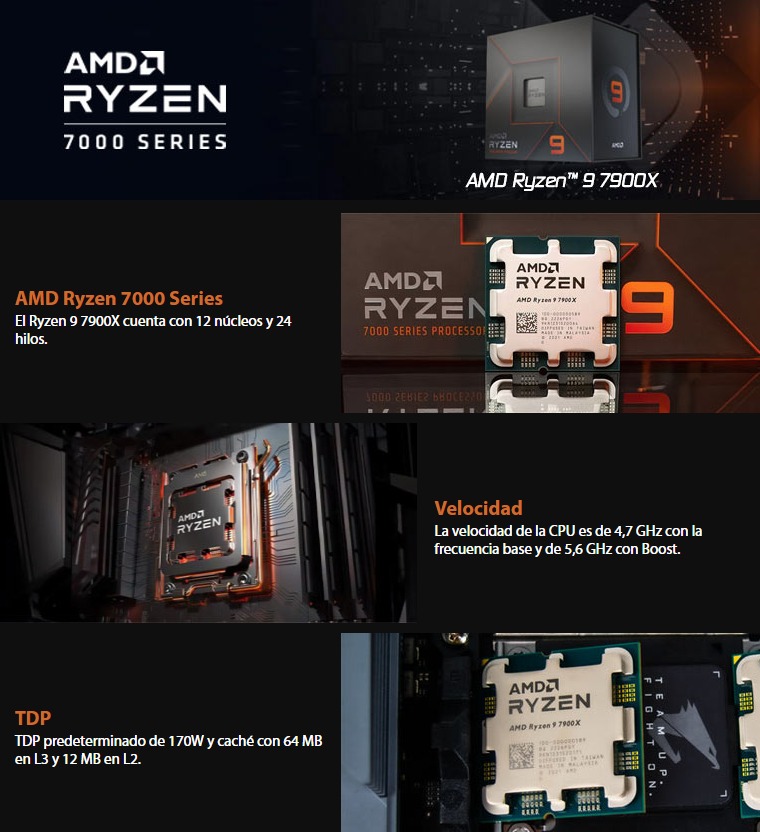 AMD Ryzen 9 7900X, un procesador que redefine el rendimiento en el mundo de la computación. Con una frecuencia base de 4.7 GHz y la capacidad de alcanzar hasta 5.6 GHz en modo turbo, este procesador está diseñado para ofrecer una experiencia de usuario excepcional, ya sea para juegos, edición de video o tareas de alto rendimiento.