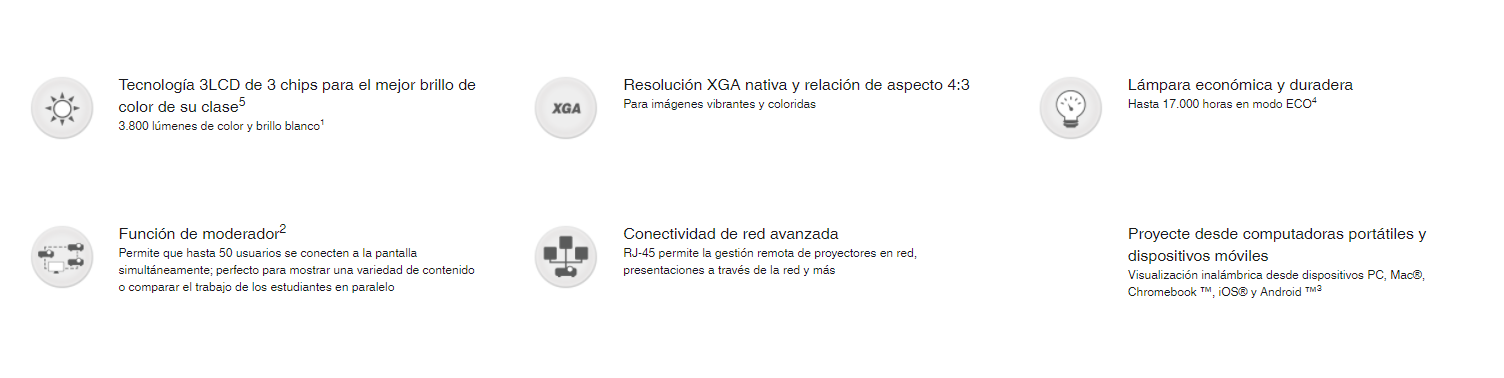 Sistema de Proyección:Tecnología Epson 3LCD de 3 chipsMétodo de Proyección:Frontal / Posterior / TechoPantalla LCD:0,55 pulgadas (C2fine)Método de visualización:Poly-silicon TFT active matrixNúmero de Pixeles:786.432 pixeles (1.024 px x 768 px) x 3Luminosidad en Color:3.800 LúmenesLuminosidad en Blanco:3.800 LúmenesRelación de Aspecto:4:3Resolución Nativa:XGATipo de Lámpara:210 W UHEVida Útil de la Lámpara:8.000 horas (Normal); 17.000 horas (ECO)Corrección de Trapecio:Vertical: -30° +30º