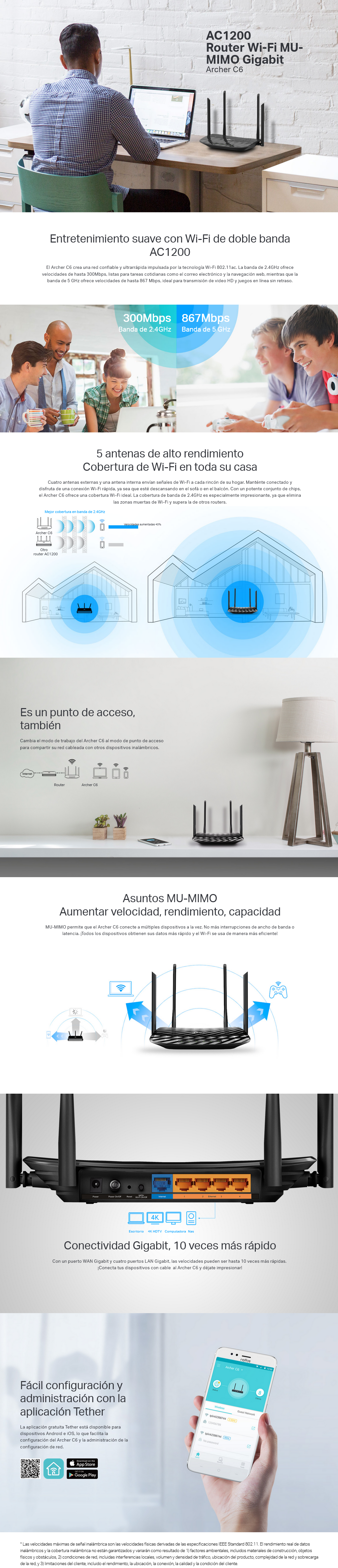 - Conexiones simultáneas de 2.4GHz a 300 Mbps y 5GHz a 867 Mbps para 1200 Mbps de ancho de banda total disponible