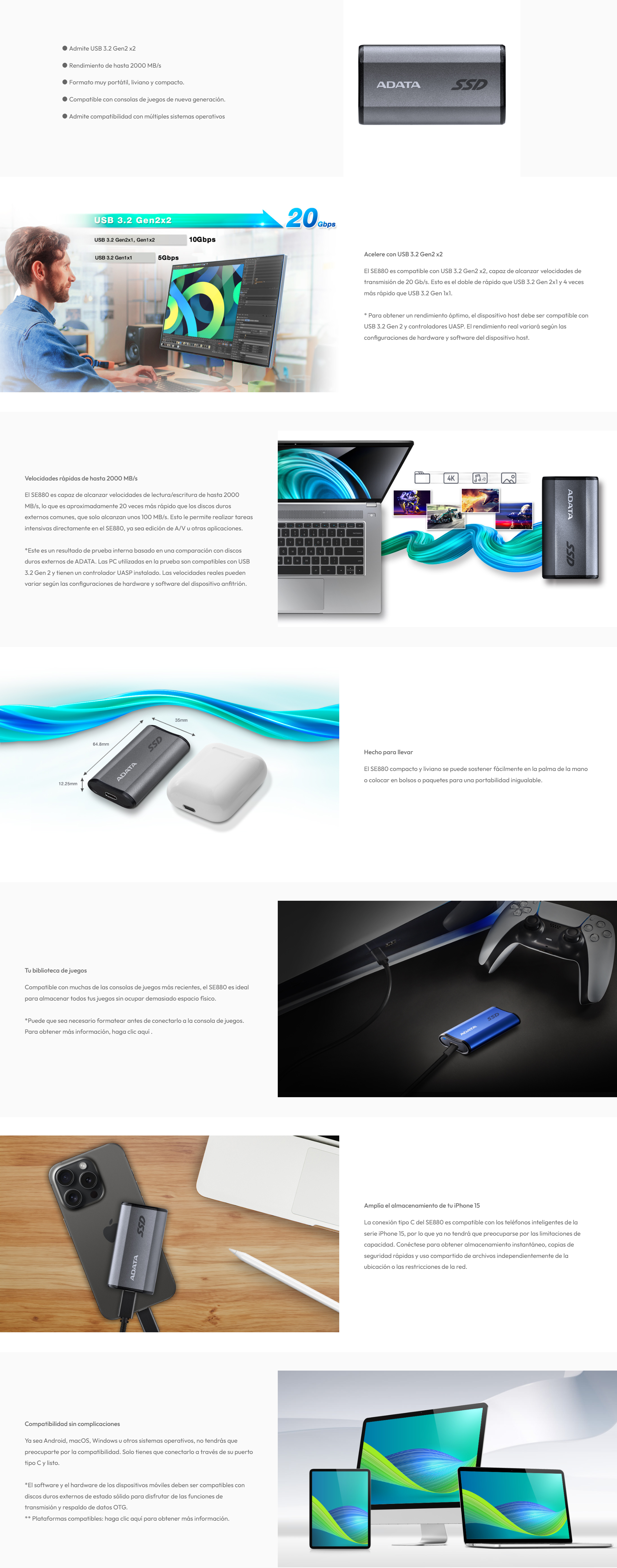 Unidad Ssd Externo Adata Elite 1Tb Se880 Usb-C 3.2 G2 Lec 2000Mb/S Esc 2000Mb/S Unidad Ssd Externo Adata Elite 1Tb Se880 Usb-C 3.2 G2 Lec 2000Mb/S Esc 2000Mb/S