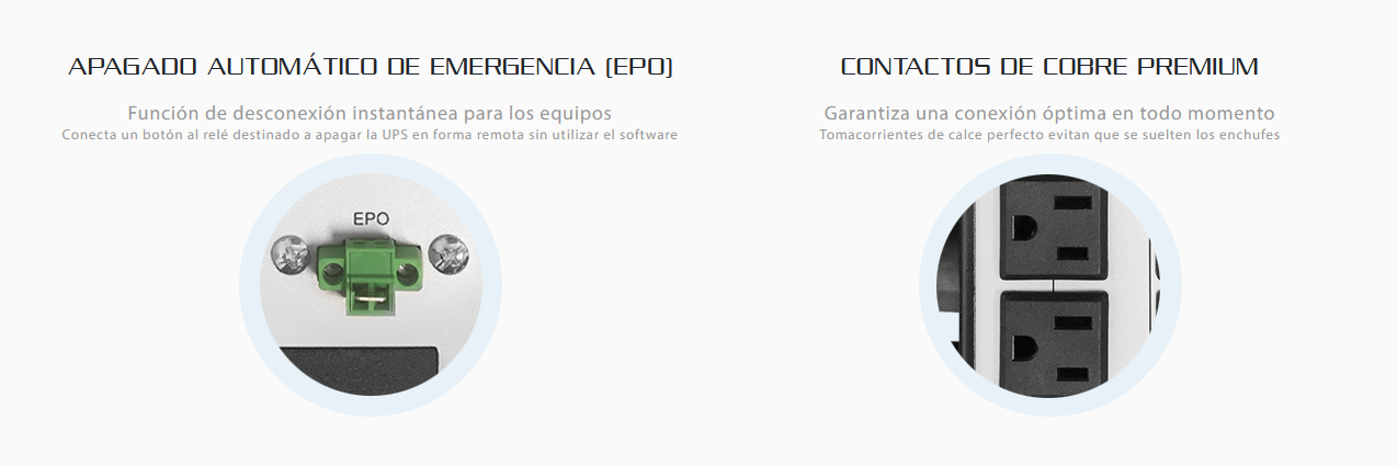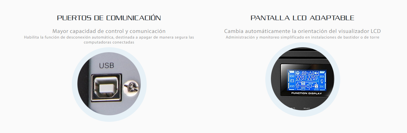 - Puertos de comunicación: Incluye SNMP, RS-232, USB